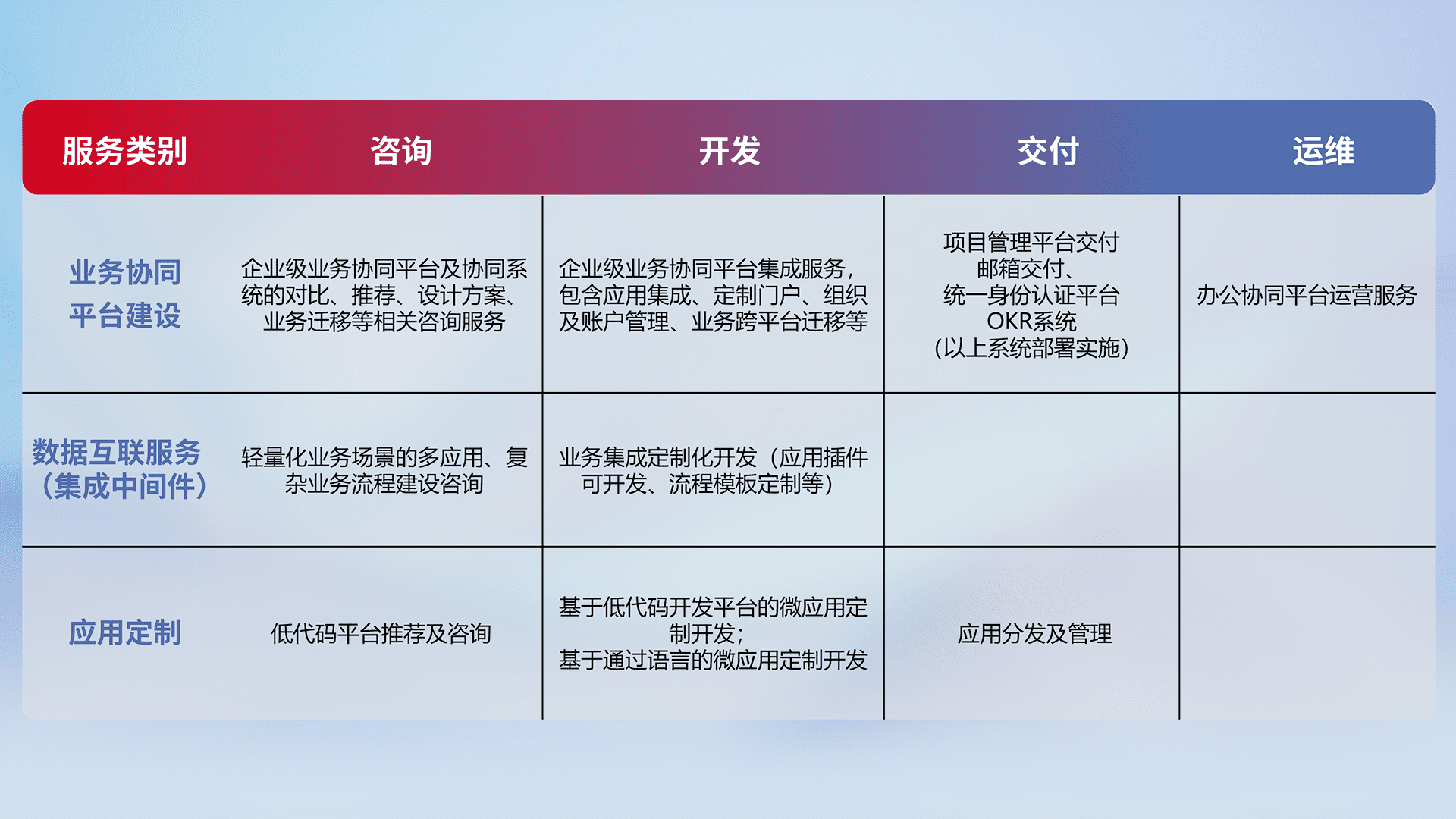 针对钉钉、、、、企微、、IDaas等平台级产品提供产品的规划、、、、方案、、、交付、、定制化开发等服务,,实现如统一协同办公、、、、智能客户服务、、混合会议管理、、、、智能数据查询、、、、等业务场景,,,,实现数字化转型。。。